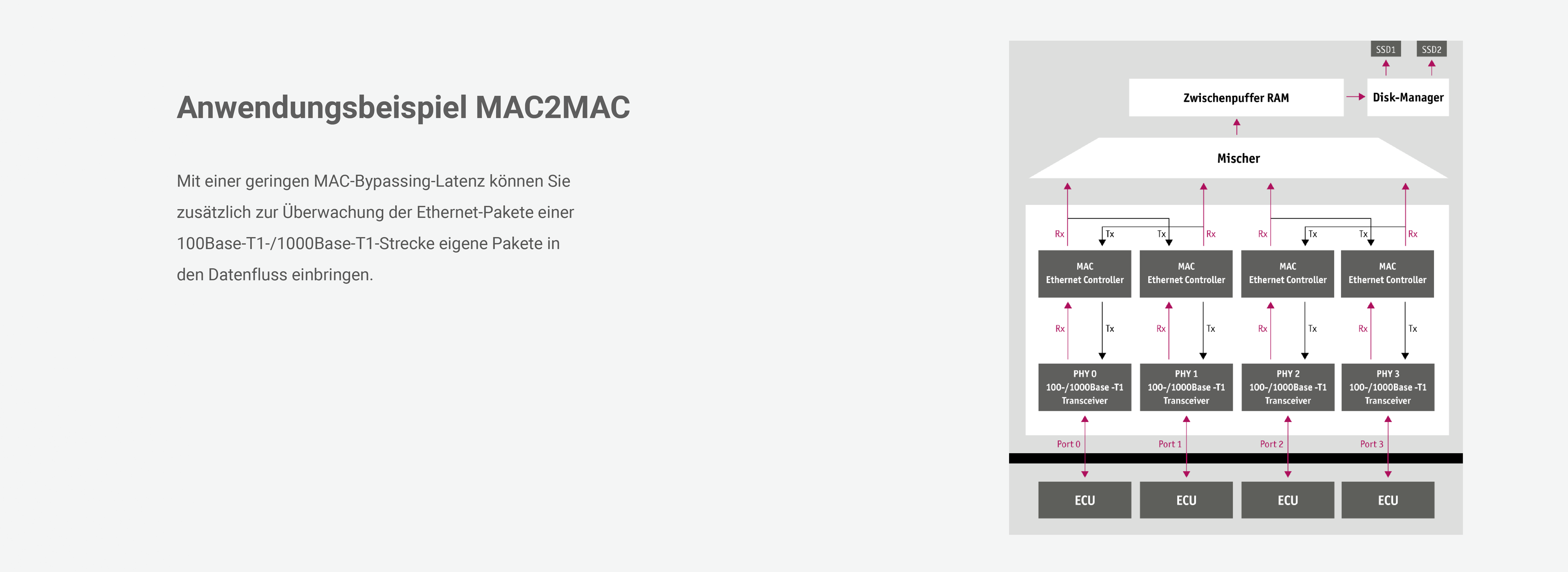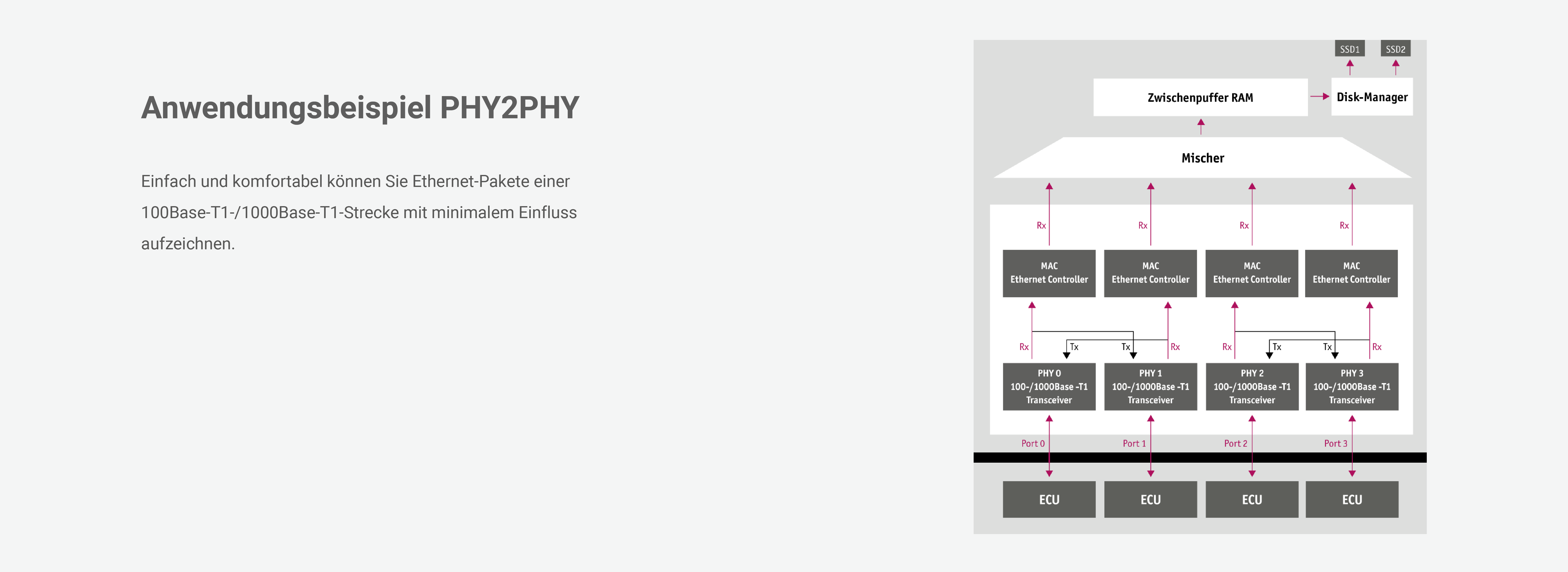 GL5450 ist ein Ethernet-Datenlogger, der zum Erfassen und Aufzeichnen von Automotive-Ethernet Daten dient. Der GL5450 kann Daten von bis zu 20 x 100-Base-T1 und 6 x 1000Base-T1–Schnittstellen mit einer hochpräzisen Zeitstempel-Auflösung von 64 ns auf bis zu 2 SSDs loggen. Dank der intelligenten Filterfunktion auf Nibble-Ebene der Felder des Ethernet-Frames, wie z.B. MAC-Adresse und Protokoll, können irrelevante oder auch personenbezogene Daten von der Aufzeichnung ausgeschlossen werden. Damit werden die Anforderungen der DSGVO erfüllt und nur die wirklich notwendigen Daten aufgezeichnet. Dies verringert auch den Aufwand bei der Auswertung der Daten.